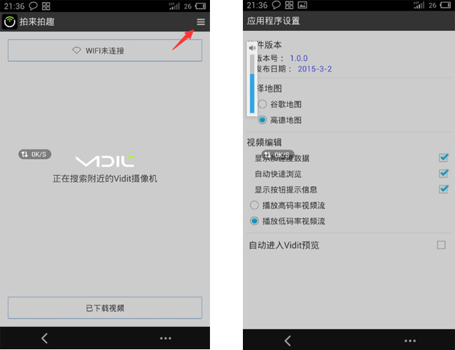 针对APP操作,在官网(http://www.vidit.com.cn/)下载("拍来拍趣")与手机对应系统的安装包后,安装即可;打开软件后即出现app搜索摄像机设备的界面;