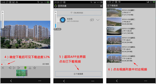3) APP的文件夹中,可在手机上脱机(与摄像机脱离)播放;反应到手机app上对应的路径按钮为"已下载视频";