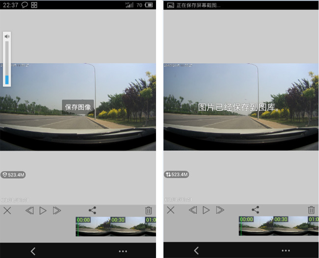 在视频播放界面,单击视频播放主画面,画面上方出现"保存图像"文字提示,点击文字,提示"图片已保存到图库"。