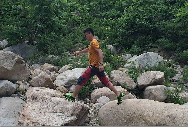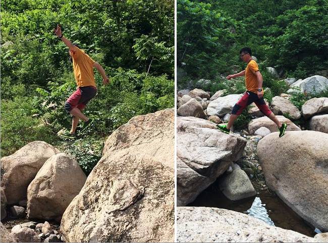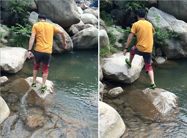 有的时候,我就像一个大孩子,喜欢在石头之间跳来跳去(建议没有相关经验和锻炼的朋友不要轻易尝试),亚伦依旧很稳定,就像全时四驱一样,没有丝毫的打滑,鞋身对脚的支撑和保护也非常棒。
