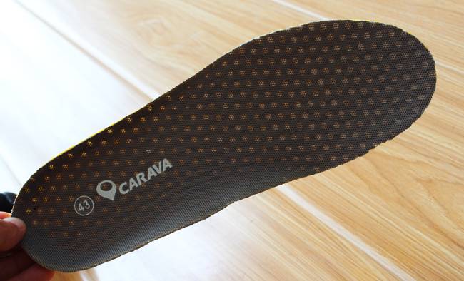 从侧面看亚伦溯溪鞋的鞋底,中底厚实,对鞋子前后左右的包裹也非常到位;大底(黑色吸盘)牢固于整个中底的底部,使鞋子着地更稳健。