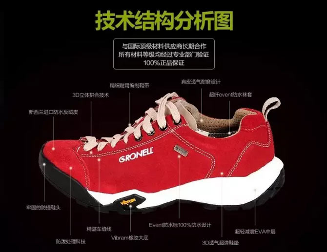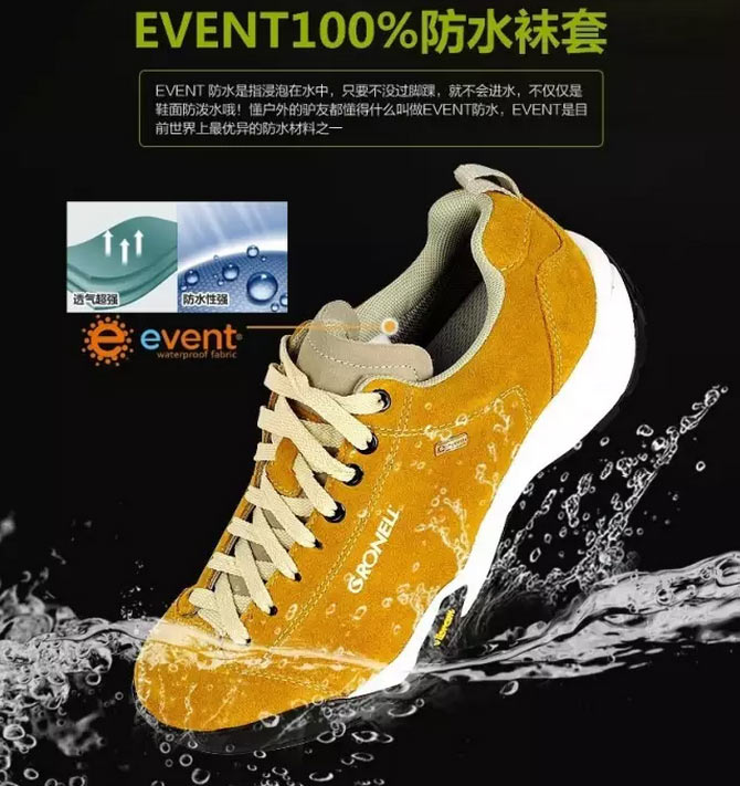 一、鞋内采用超纤EVENT防水袜套,使鞋内干爽透气并具有很高的防水性能;