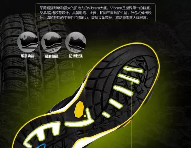 二、鞋底采用航空飞机外胎Vibram Q935橡胶大底,高密度防滑耐磨;