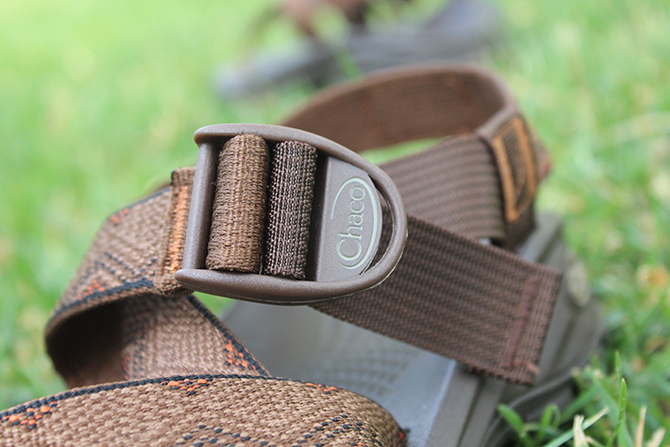 带有Chaco LOGO的可调节的安全锁扣,使用了惯用的齿牙扣紧尼龙提花织带方式,操作简单,而且很容易固定鞋带不会滑动。