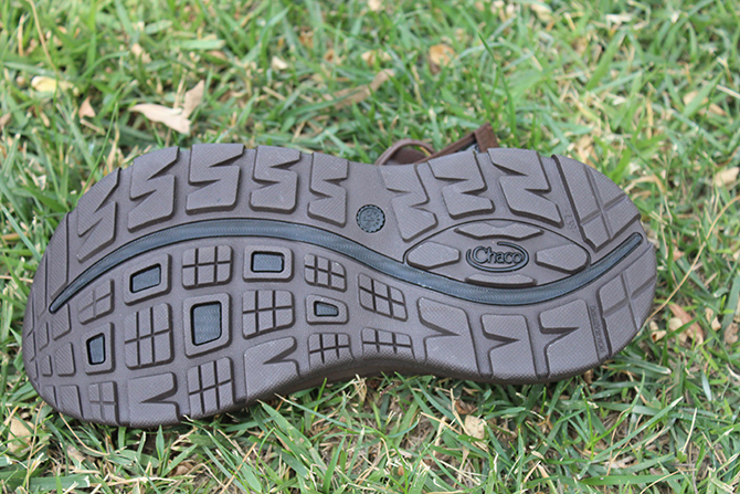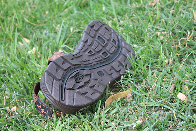 尽管Chaco Z VOLV的鞋底没有采用Vibram大底,但是从下图的鞋底中可以看出鞋底的底纹深度,而且采用了不对称的多底纹设计,增加了鞋子的防滑性能。在鞋子的中间部分带有曲线排水槽。