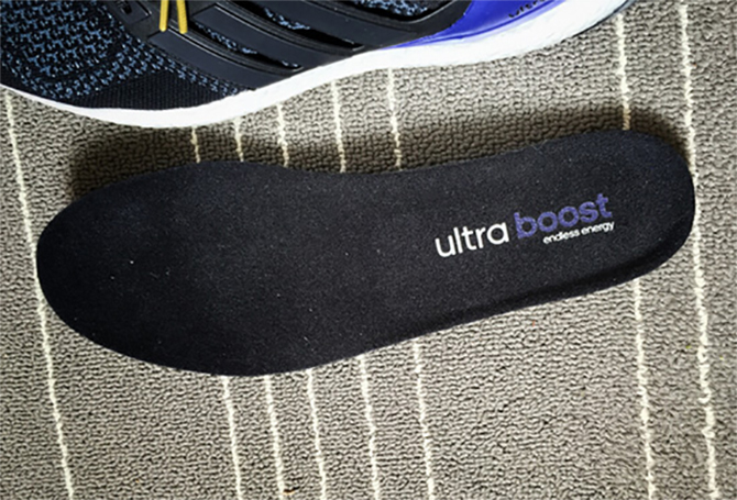 鞋跟与鞋口处往往是许多跑鞋设计上所忽略的地方,而Ultra Boost在这些地方都进行了独具匠心的处理。鞋舌不再是单独的部分,而是延伸至后跟形成了一个U型弧度收口的内靴,搭配更具弹力与透气面料的内里保证了脚踝的包裹与稳定,同时也顺便解决了鞋舌固定对于跑鞋的普遍难题。