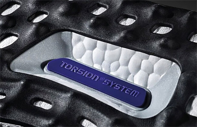 将Torsion System植入中底能够很好地解决整个鞋底的完整性设计,而对于Boost高弹的材料特点来说,一个完整无割裂的鞋底设计能够更加出色地发挥出它所应有的特性。